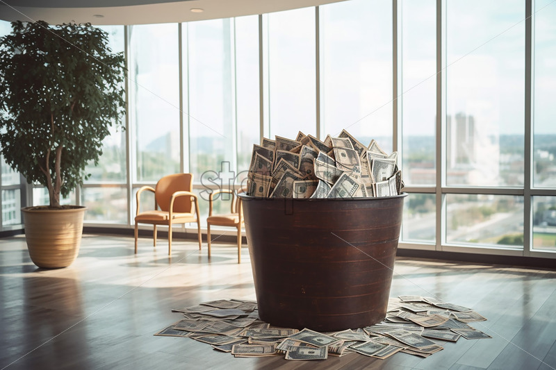 Generative AI a bucket full of paper money a bucket full of paper money lying on the floor in the office, in the background is the window and you can see the buildings of a cit