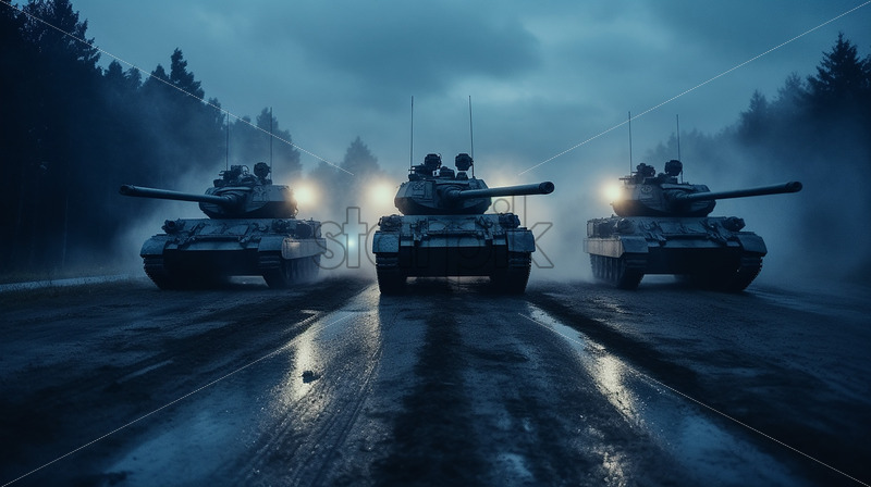 Generative AI a column of modern tanks goes down a road