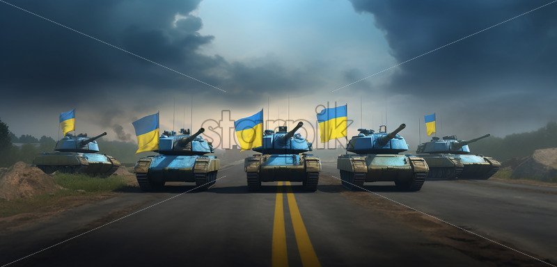 Generative AI a column of modern tanks goes down a road flying the flag of Ukraine