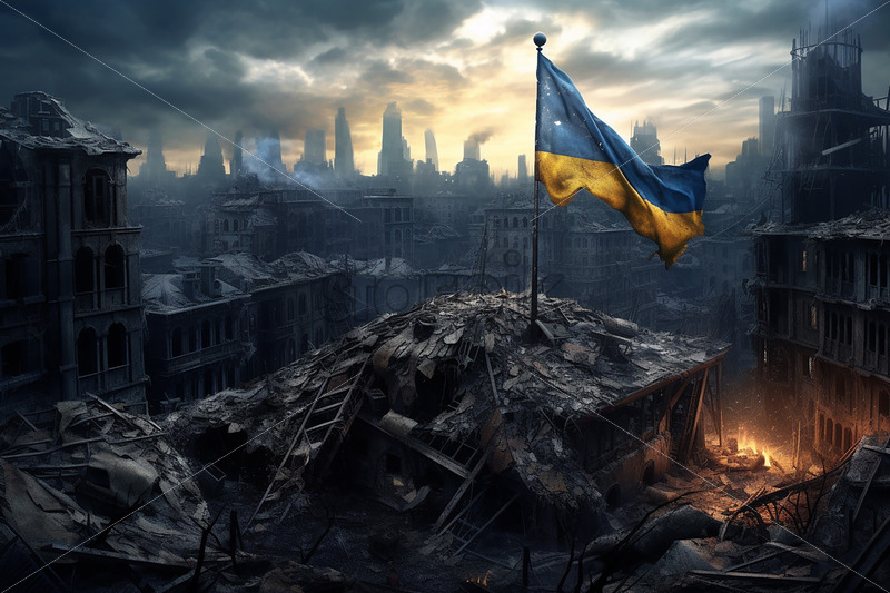 Generative AI a destroyed building on which the flag of Ukraine flies and in the background a city in ruins