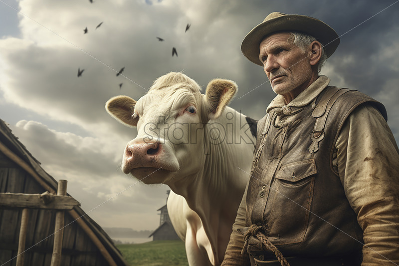 Home » Shop » AI Illustration » Generative AI a farmer next to a cow from his farm