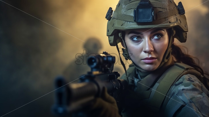 Generative AI a female soldier with a gun in her hand on the battlefield