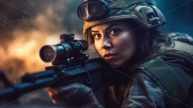 Home » Shop » AI Illustration » Generative AI a female soldier with a gun in her hand on the battlefield