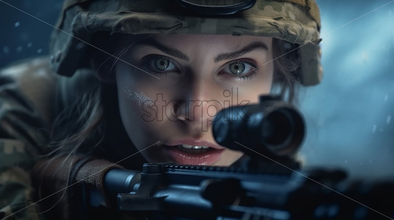 Generative AI a female soldier with a gun in her hand on the battlefield