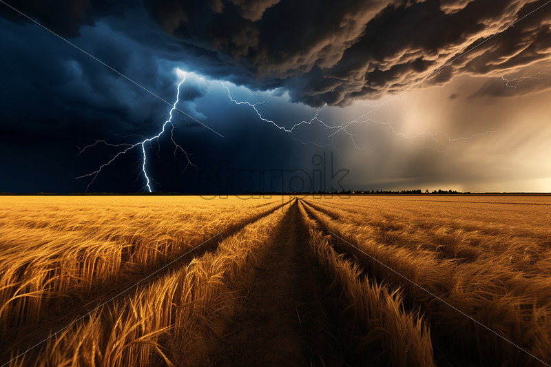 Generative AI an agricultural field and there are black clouds and lightning in the sky