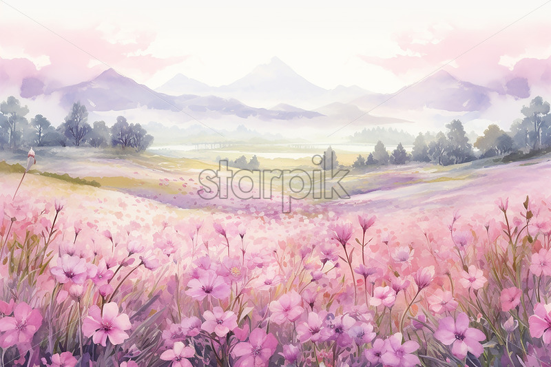 Generative AI a mountain landscape with a plain full of multicolored flowers and different species