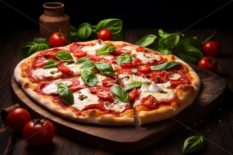 Home » Shop » AI Illustration » Generative AI a fresh pizza with mozzarella, basil, tomatoes and ham