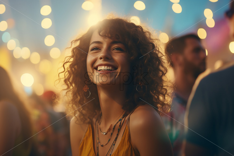 Happy woman listening to music on wireless headphones connected to mobile phone, on the streets at sunset Royalty Free Stock photo