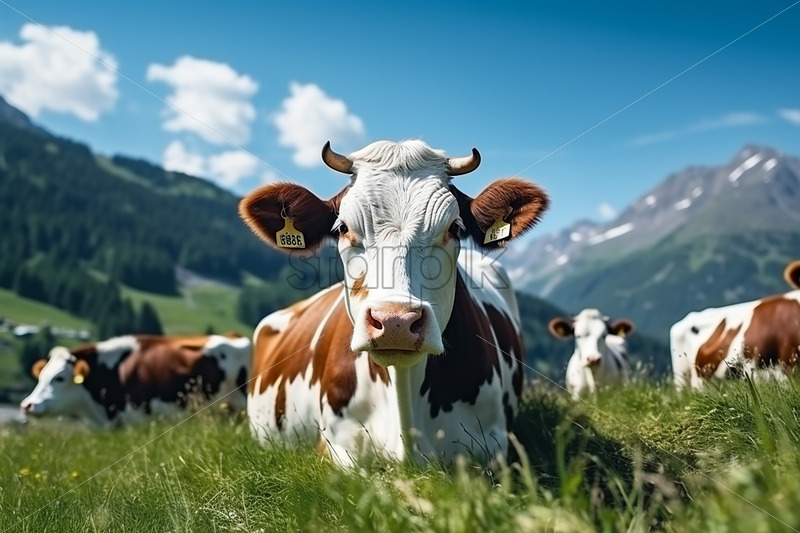 Generative AI a herd of cows and a cow in the foreground on a mountain meadow