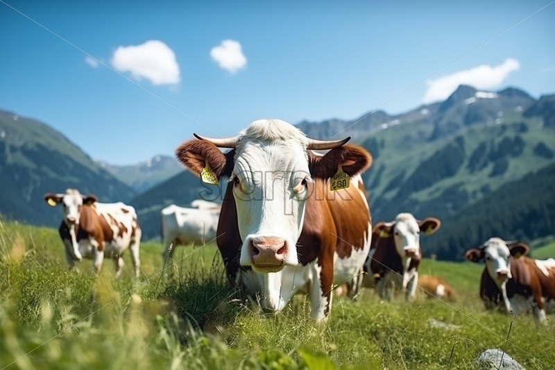 Generative AI a herd of cows and a cow in the foreground on a mountain meadow