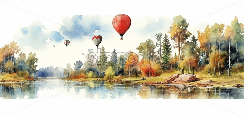 Generative AI a landscape of a forest through which a river passes and hot air balloons