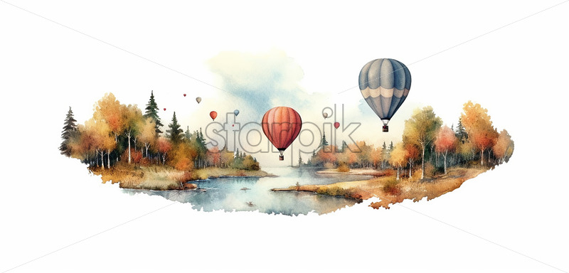 Home » Shop » AI Illustration » Generative AI a landscape of a forest through which a river passes and hot air balloons
