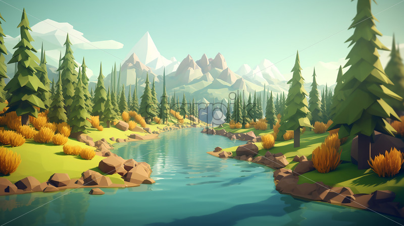 Generative AI a landscape that represents a lake, a hill, mountains, a forest of conifers, bushes and stones