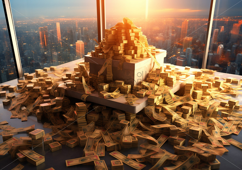 Generative AI a lot of money lying on a table in the office with a city in the background