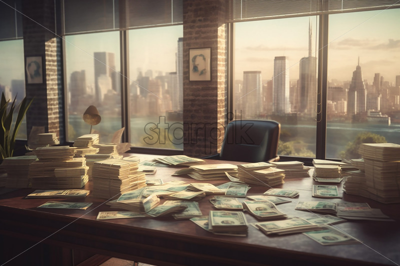 Generative AI a lot of paper money on a desk next to a window and a beautiful city in the background