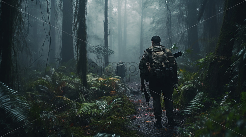 Home » Shop » AI Illustration » Generative AI a military scout sneaks through the forest in a military uniform