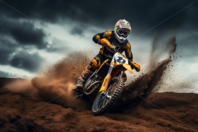CHISINAU, MOLDOVA – SEPTEMBER, 2022: View of a riding motorcyclist at a motocross race, mud track, rally motorcycle, greenery around