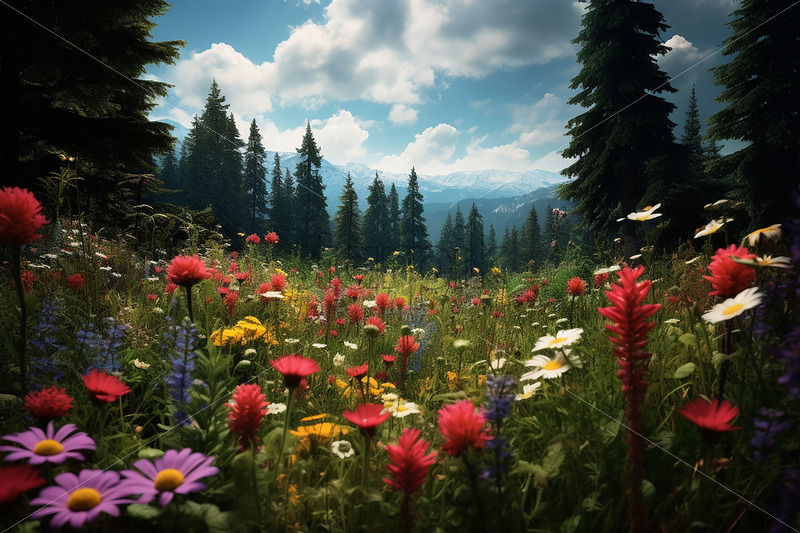Home » Shop » AI Illustration » Generative AI a mountain landscape with a plain full of multicolored flowers and different species