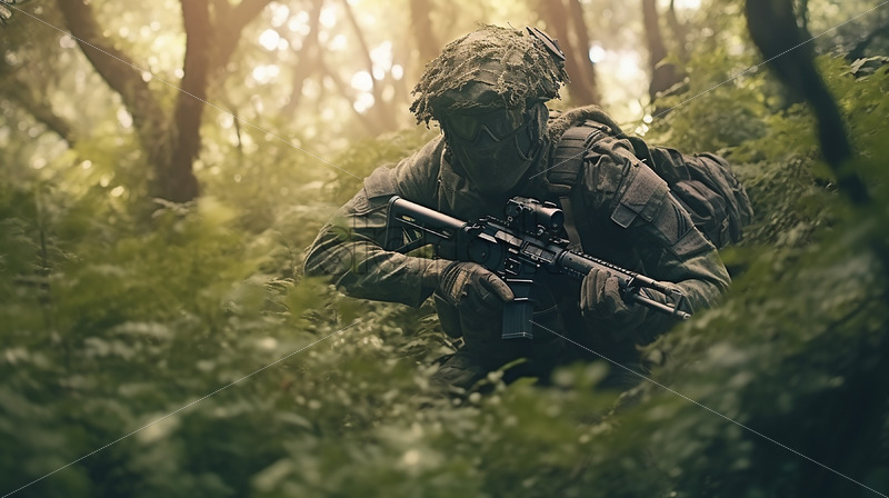 Home » Shop » AI Illustration » Generative AI a scout analyzes the positions of the opponents being hidden in the bushes