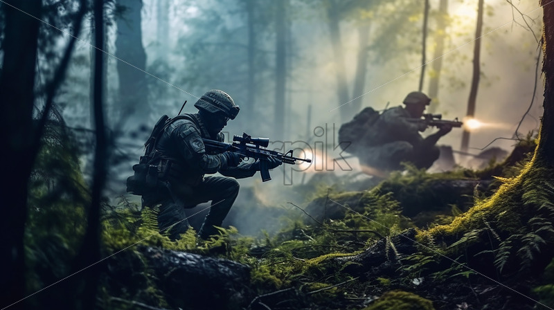 Home » Shop » AI Illustration » Generative AI a soldier firing his gun against a forest background