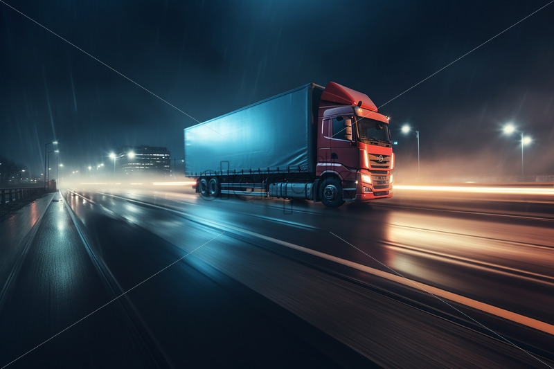 Moving red truck carrying trailer with modern building on the background in Boston, USA