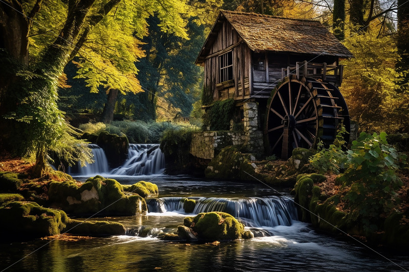 Home » Shop » AI Illustration » Generative AI a water mill on a river in the mountains