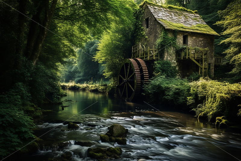 Home » Shop » AI Illustration » Generative AI a water mill on a river in the mountains