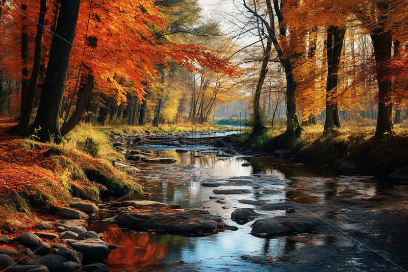 Generative AI an autumn landscape with a river and a forest with fallen leaves