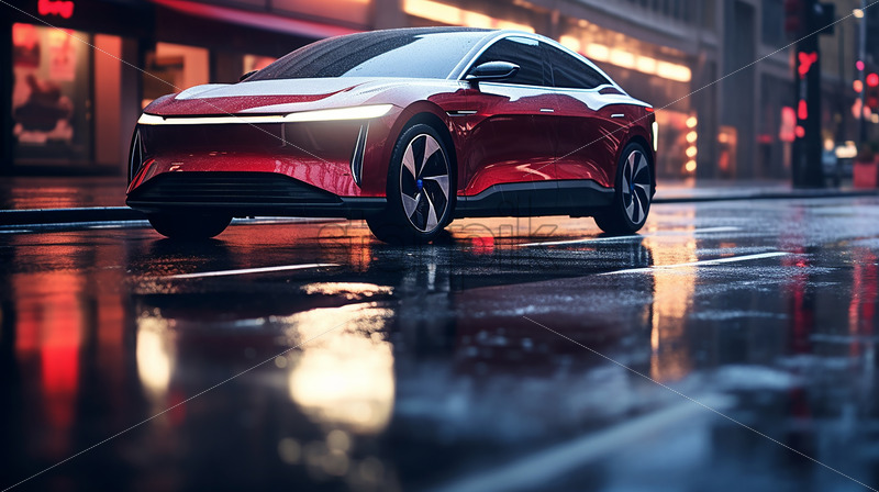 Home » Shop » AI Illustration » Generative AI an electric car driving on a wet street with light reflections on it
