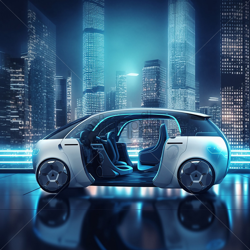Generative AI autonomous futuristic car with gigantic buildings in the background