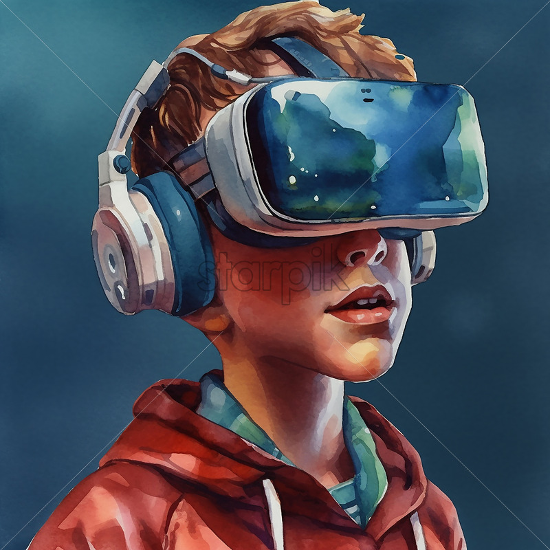 Generative AI Boy wearing VR and music headset painted in watercolor on a blue background