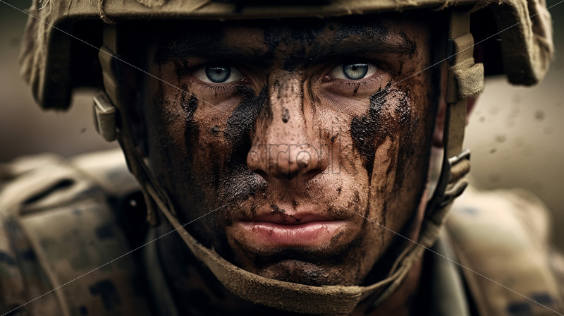 Generative AI close-up portrait of a soldier with a dirty face during a battle