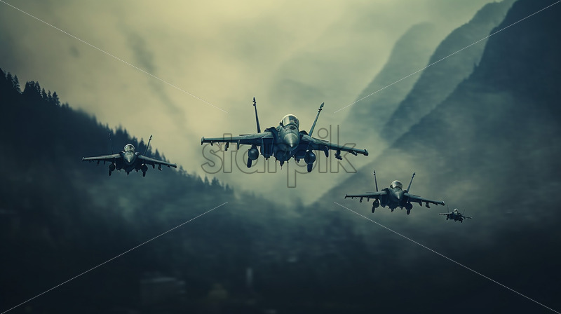 Generative AI four fighter planes in flight over some mountains