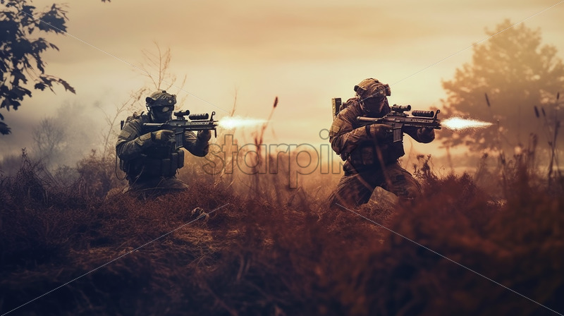 Generative AI soldiers shooting in the background of a field