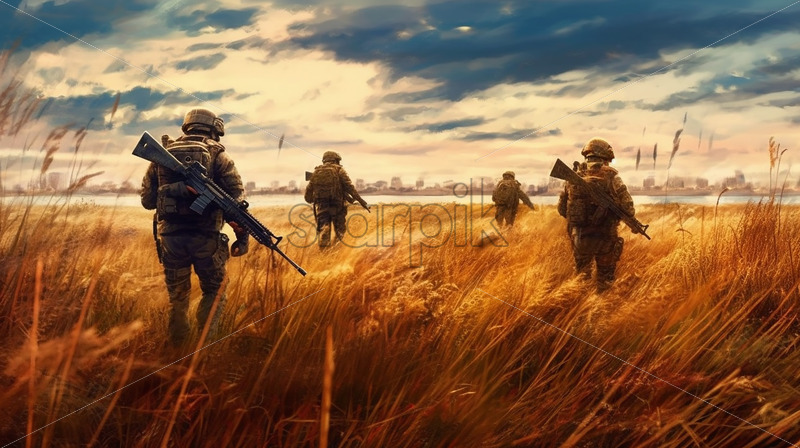 Generative AI soldiers walking through a field of wheat towards a city