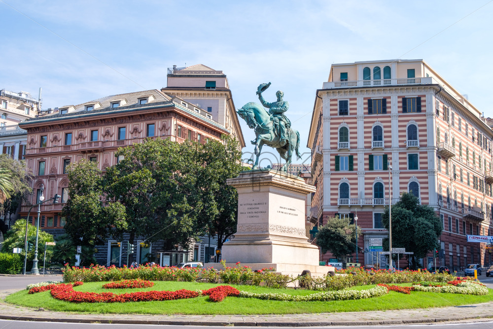 GENOA, ITALY – AUGUST 05, 2018: Piazza Corvetto at daylight with Vittorio Emanuele II equestrian statue. Buildings and bright blue sky Royalty Free Stock photo
