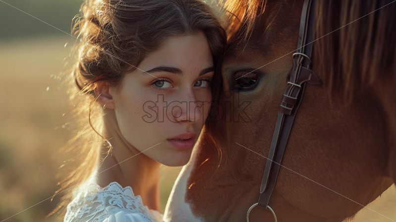 Genuine woman and her horse in the countryside