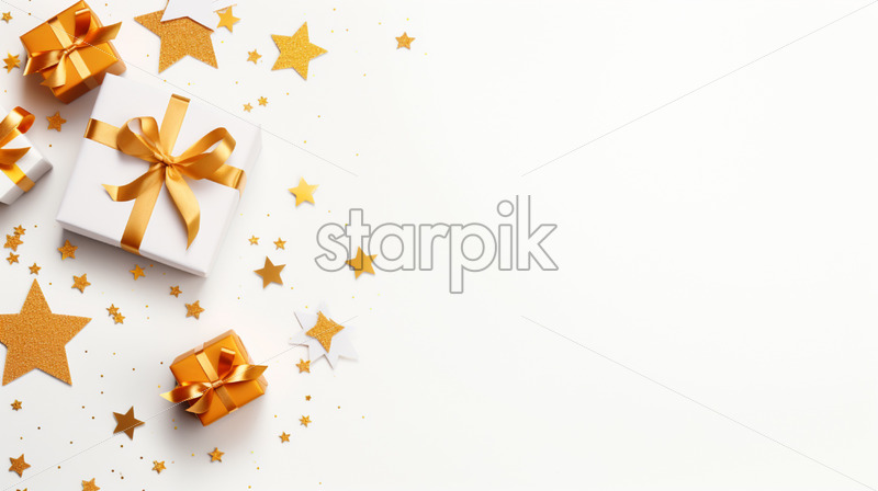 Top view giftbox with gold ribbon bow and yellow tulips on isolated white background