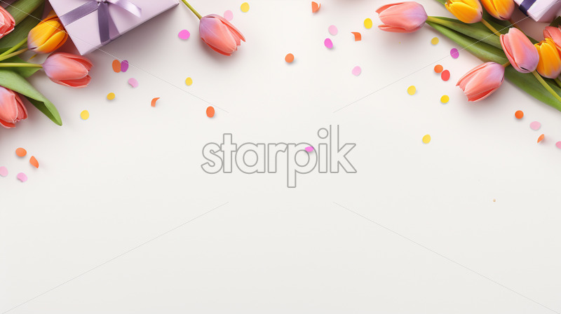 Banner with gift box and spring flowers on isolated white background