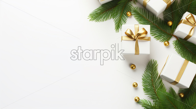Gifts, green branch, bows, pine cones and baubles in silver color. Happy New Year text. Decorations vector