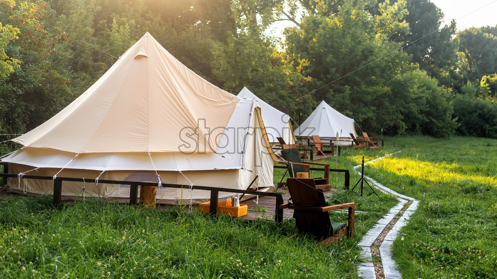 Home » Shop » photo » Glamping, few tents, chairs and pathway on the foreground, geenery around