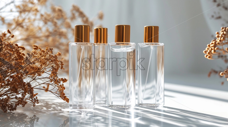 Brown glass bottles with gold lid, standing on table with tropical leaf