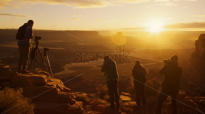 Photographers capturing the golden hour light and stunning sunset vistas in scenic locations, chasing the perfect shot as the day fades into night