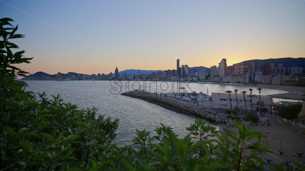 Sunset panorama of the Benidorm skyline from the Balcon del Mediterraneo in Benidorm, Spain in the evening Royalty Free Stock Video Footage