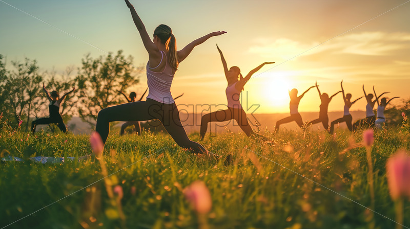 A group of women engage in a yoga session on a green field during the golden hour sunrise, captured from behind with some silhouettes shining in the sunlight.