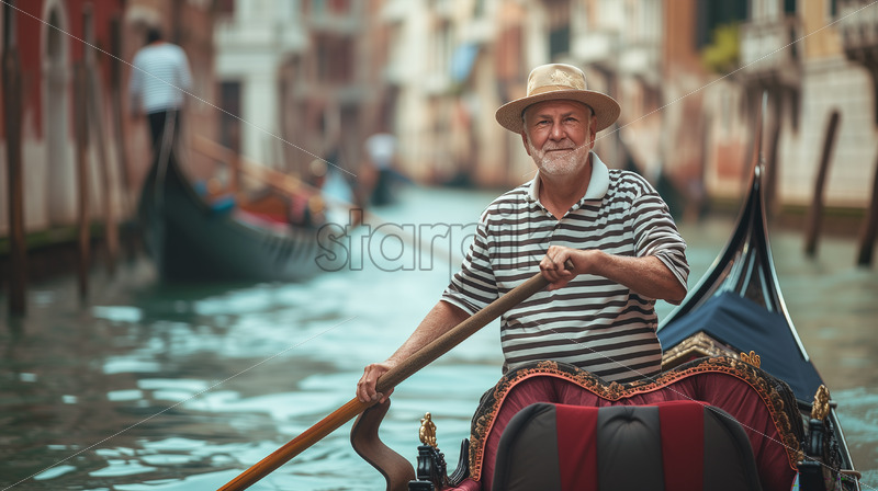 In this candid shot, a Gondolier gracefully navigates the iconic waterways of Venice, the soft ambient light from the surrounding architecture beautifully illuminating his charming and friendly expression, as he skillfully maneuvers with a gondola paddle and dons traditional attire.