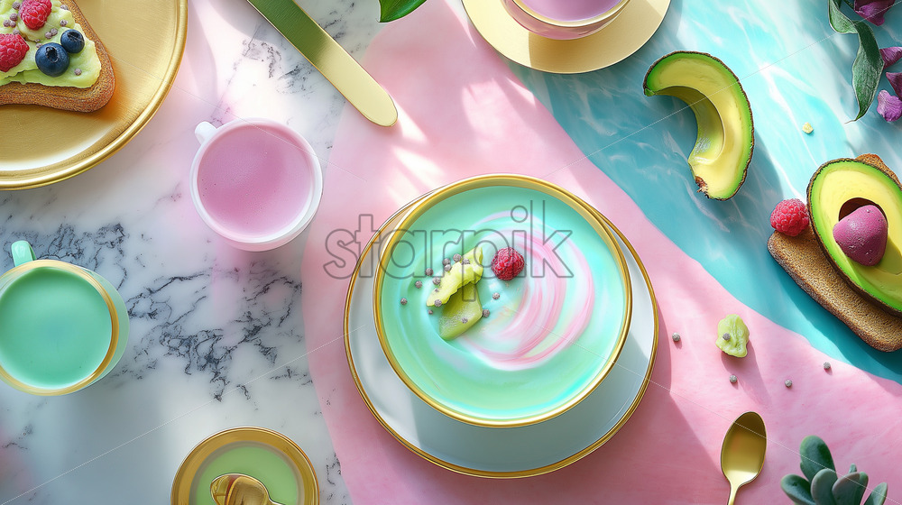 Home » Shop » AI Illustration » gourmet brunch spread featuring avocado toast, colorful smoothie
