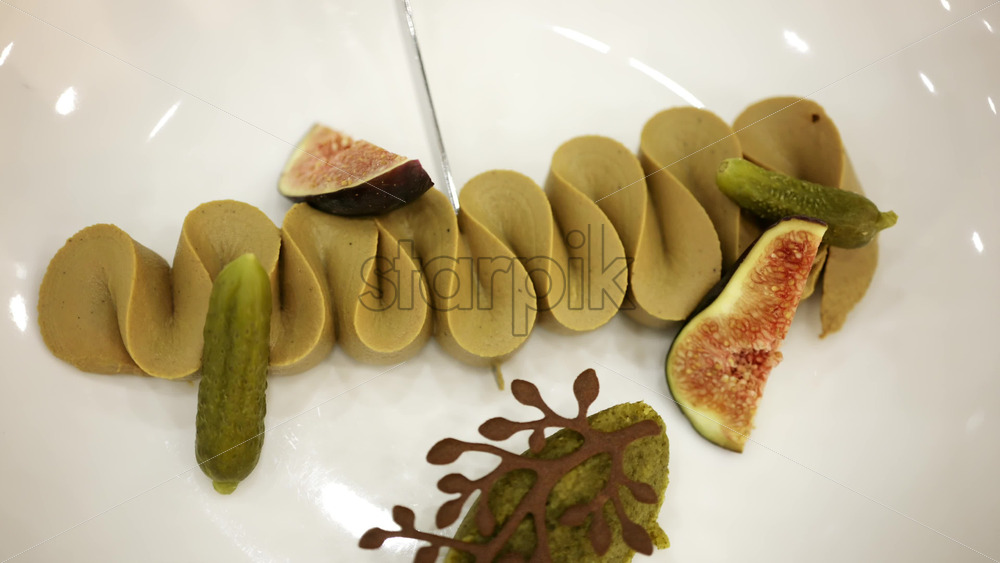 Gourmet plated dish with artistic presentation, featuring figs and decorative elements on a white plate