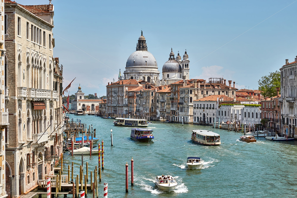 Aerial drone view of Venice, Italy. Water channels with multiple floating and moored boats, historical city centre with Santa Maria della Salute and other old buildings and narrow streets