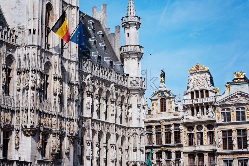 Grand place in Brussels with golden ornaments and blue sky, flags of European Union, Belgium Royalty Free Stock photo